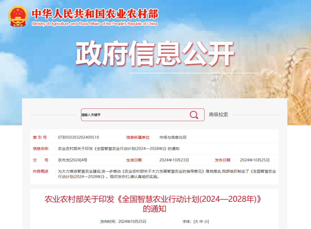 为大力推进智慧农业建设,进一步推动《农业农村部关于大力发展智慧农业的指导意见》落地落实,我部组织制定了《全国智慧农业行动计划(2024—2028年)》。现印发你们,请认真组织实施。