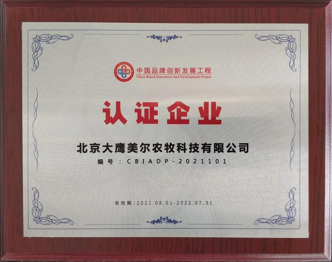 北京大鹰美尔农牧科技有限公司荣获中国品牌创新发展工程认证企业称号。