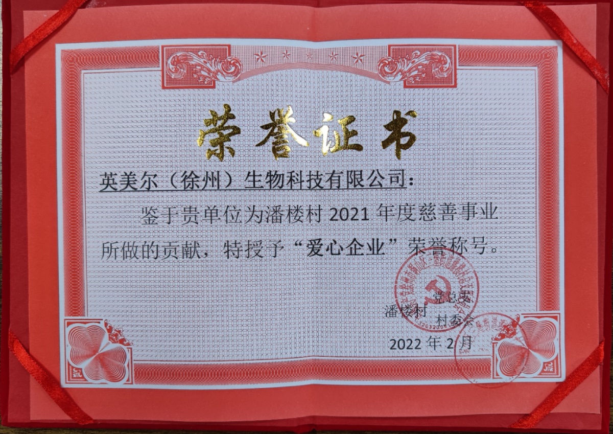 利他感恩,奉献爱心!英美尔工厂在2021年积极投身到所在地--全国文明村潘楼村的慈善事业中,荣获年度“爱心企业”称号。