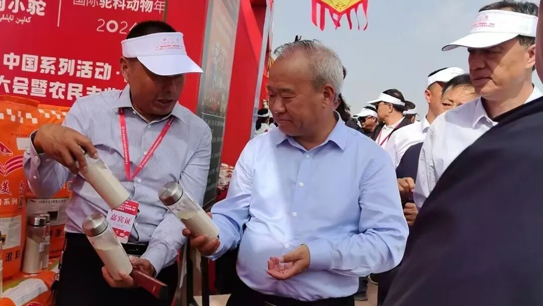 大会期间,新疆阿克苏地委委员、宣传部部长常玉轩来到英美尔展位,肯定了英美尔骆驼饲料的专业性,对产品功能的细分表示赞赏。