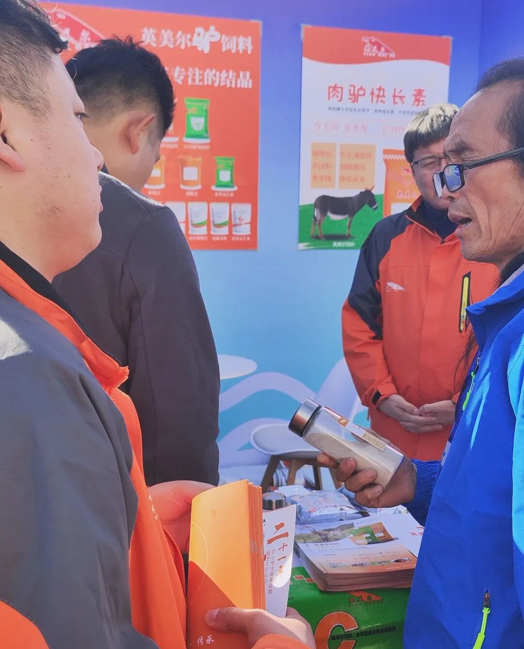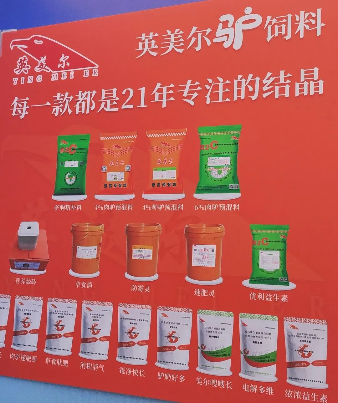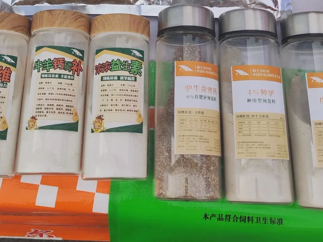 英美尔展位陈列着一系列精心挑选的特色驴用产品,这些产品凝聚着英美尔多年来在草食动物领域的智慧结晶和科研心血。产品从用料到配方,都旨在为驴业养殖提供更科学、更高效的营养解决方案,助力养殖户提升效益。