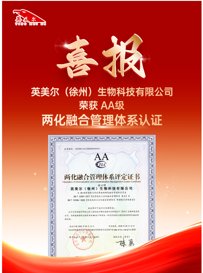 5月13日,英美尔(徐州)生物科技有限公司传来喜讯:公司顺利通过两化融合管理体系评定,荣获“两化融合管理体系AA级评定证书”。