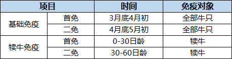 为了减少养殖场免疫工作的强度,一刀切式的免疫程序应用更多。养殖场在 3 月底 4 月初,对全群牛只进行首次免疫,4 月底 5 月初做第二次免疫,犊牛在 0-30 日龄进行首次免疫,30-60 日龄做第二次免疫。